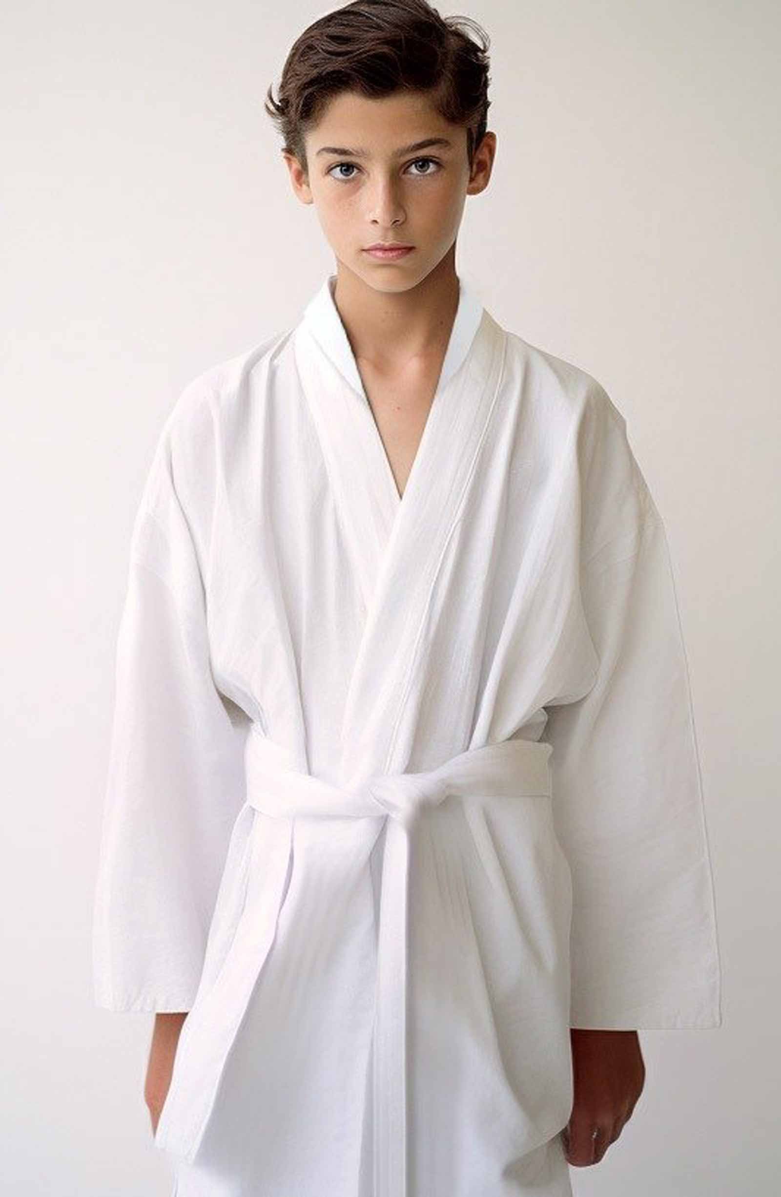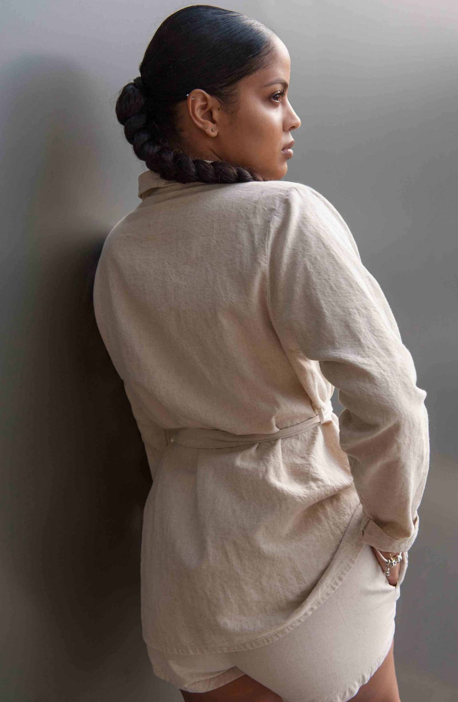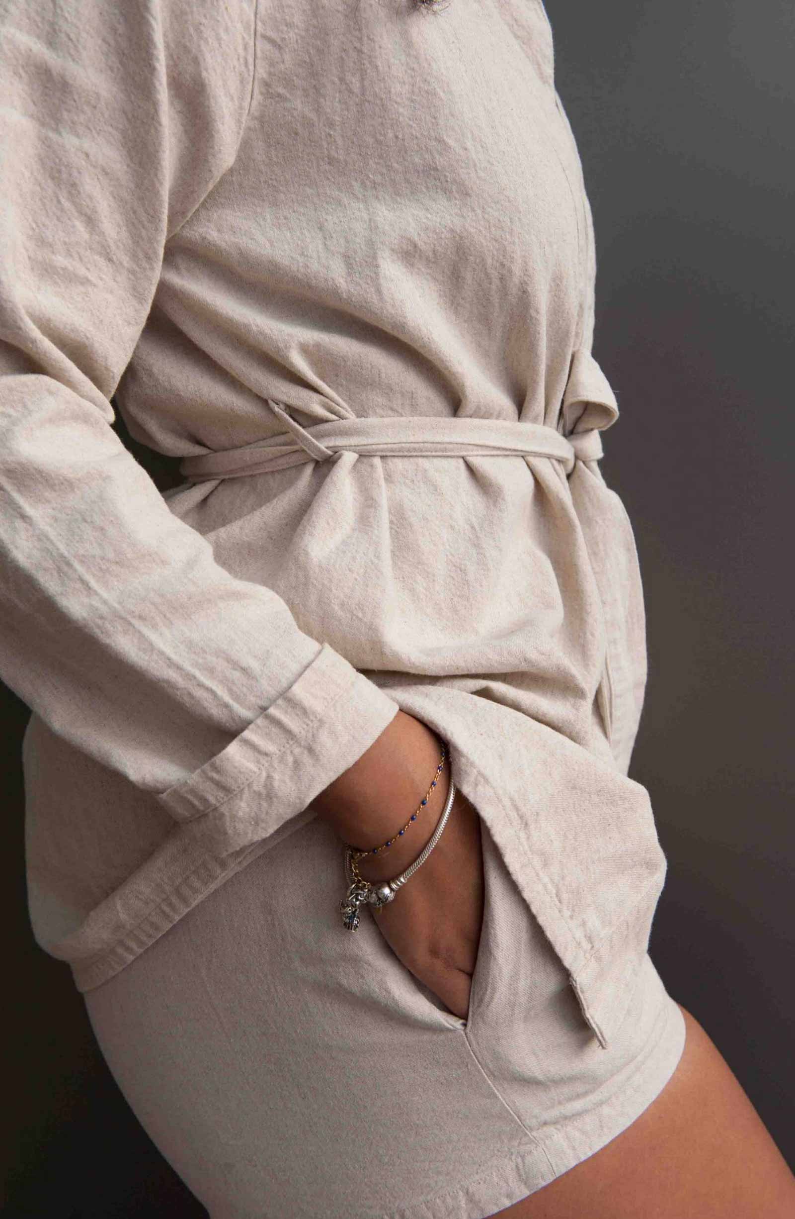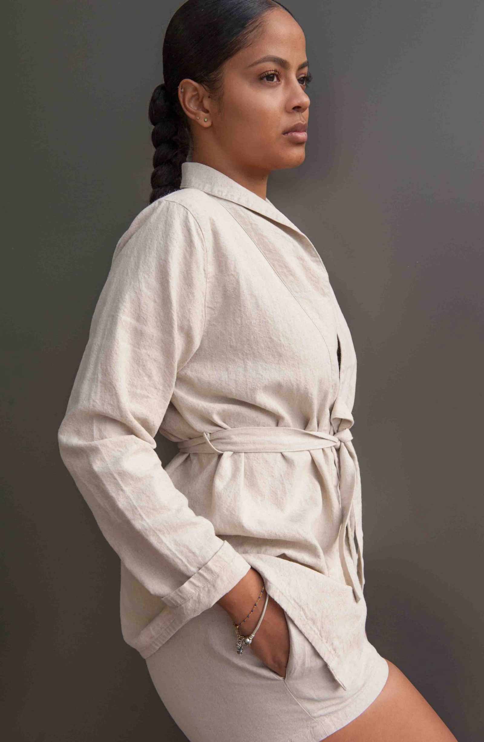 Loungewear experience. This delightful piece boasts a relaxed silhouette accentuated by a belt. Made from a premium Malagasy linen/cotton mix in white shade and stone colour, this house-jacket offers a luxurious and airy feel, ensuring unparalleled comfort with every wear. Its graceful collar wraps across the front. The comfortably wide wrist length sleeves ensure ease of movement and a chic look. Tailored to a mid-hip length, its versatile style seamlessly transitions from indoor lounging to outdoor wear, making it the perfect choice for those who like to mix it up.
