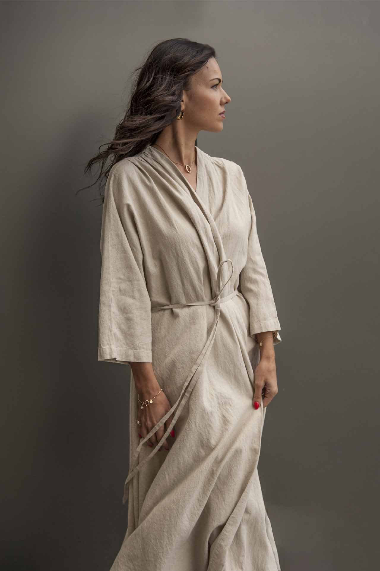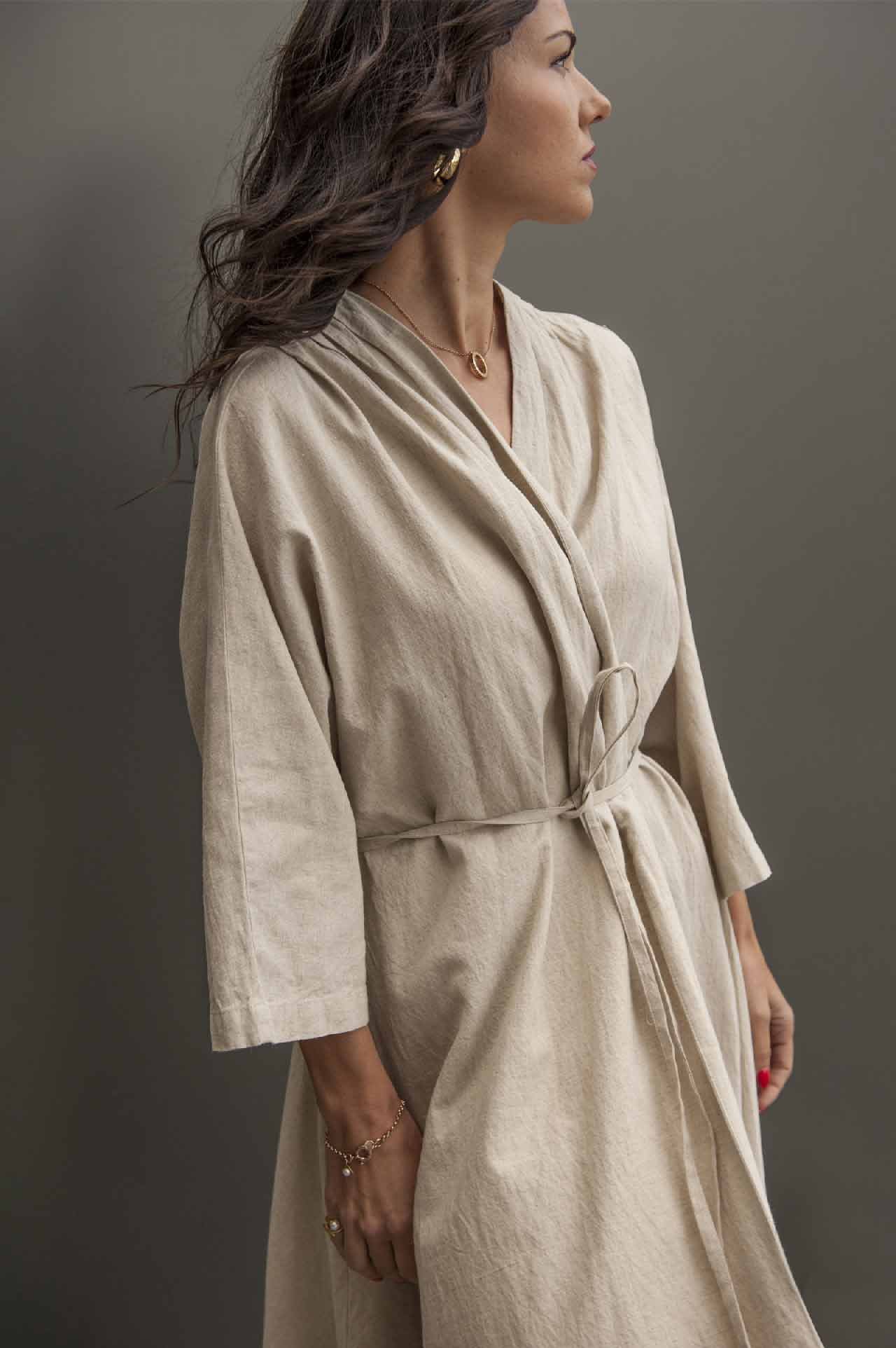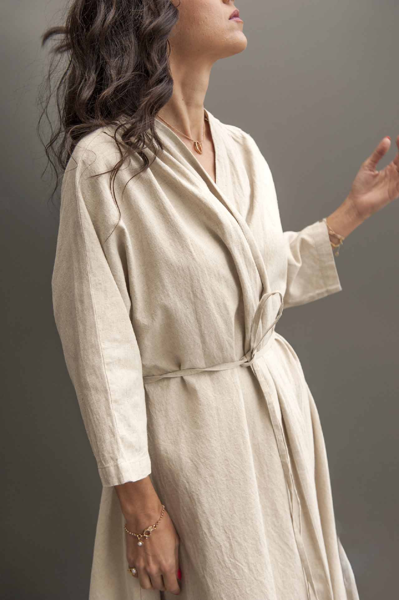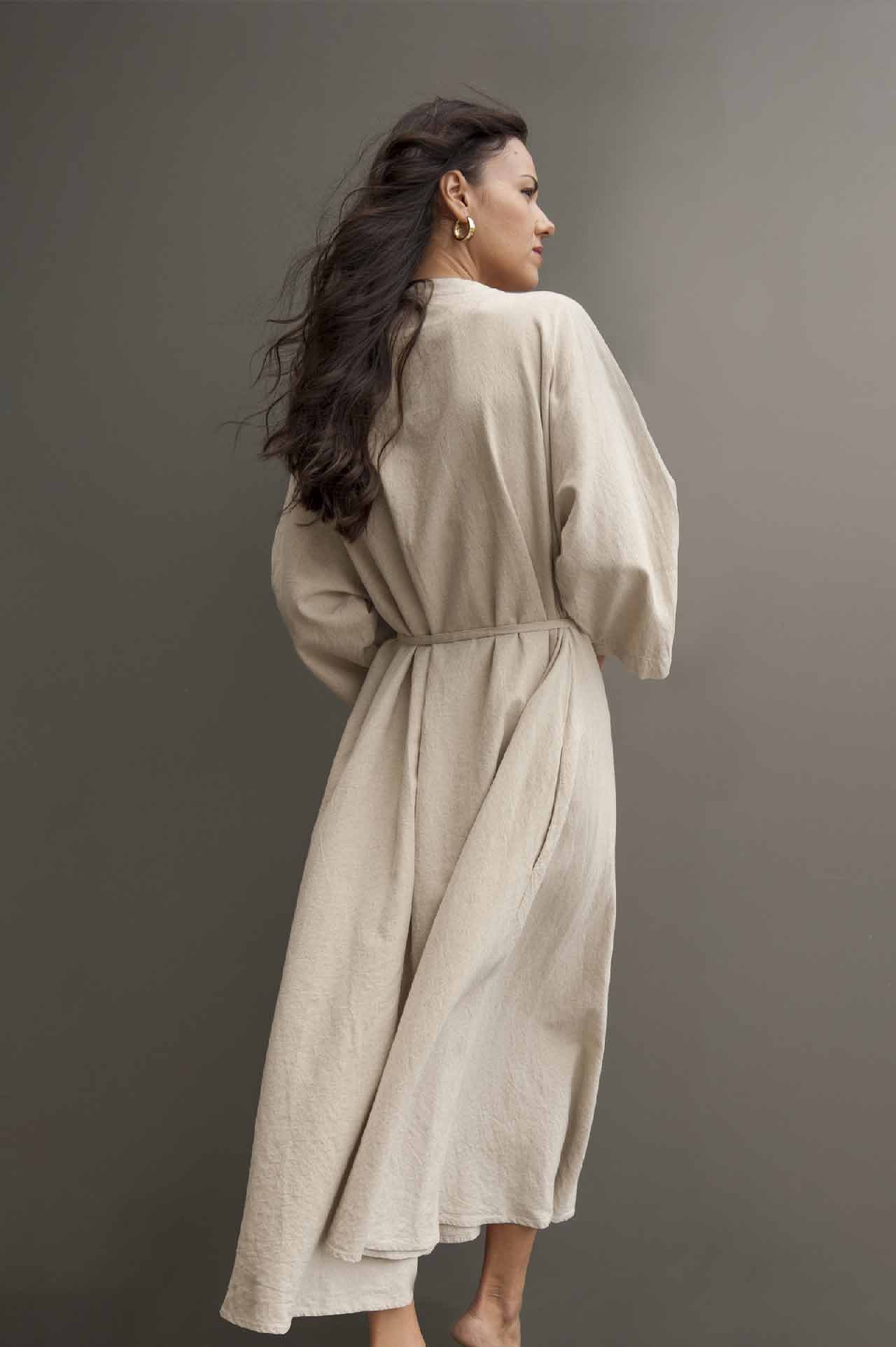 This long cotton robe that can serve as a duster coat, is meticulously crafted to celebrate your unique style. This robe boasts wrist-length sleeves that gently taper, offering a contemporary yet comfortable silhouette.