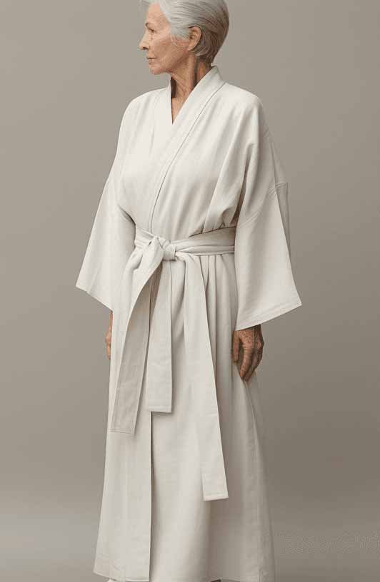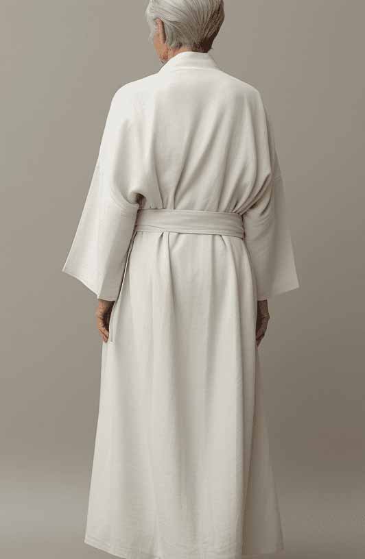 This gracefully elongated robe was designed to empower your individuality. Inspired by the elegance of a ball gown yet exuding minimalist charm, this exquisite garment extends just past the ankle, ensuring an aura of timeless refinement.
